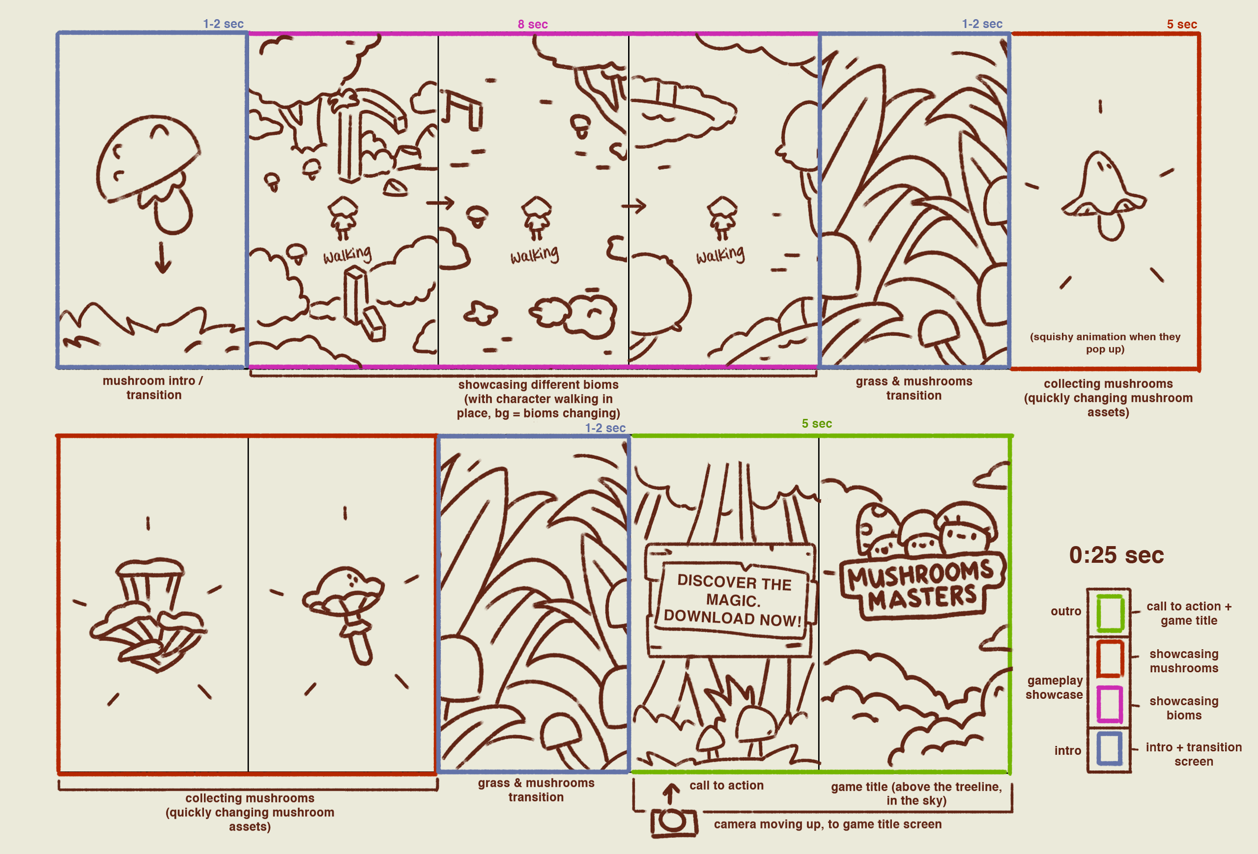 For the Mushroom Masters project, TUUDEE delivered a comprehensive suite of animated marketing assets designed to showcase the game and engage its audience across platforms. Our main focus was producing an eye-catching game trailer and a set of short modular videos (ranging from 10 to 30 seconds each), tailored for social media and app stores. These videos featured hand-drawn 2D animation, stylized transitions, dynamic splash screens, and segments of gameplay, all synchronized with custom motion graphics and music to give the content a lively and cohesive look.